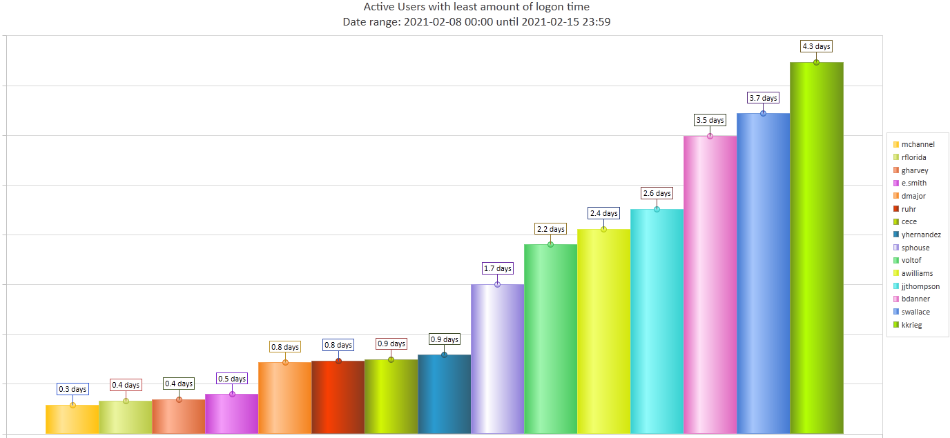 The following is a built-in Dashboard chart showing users who had logged in during the report period but had the least amount of logon time.